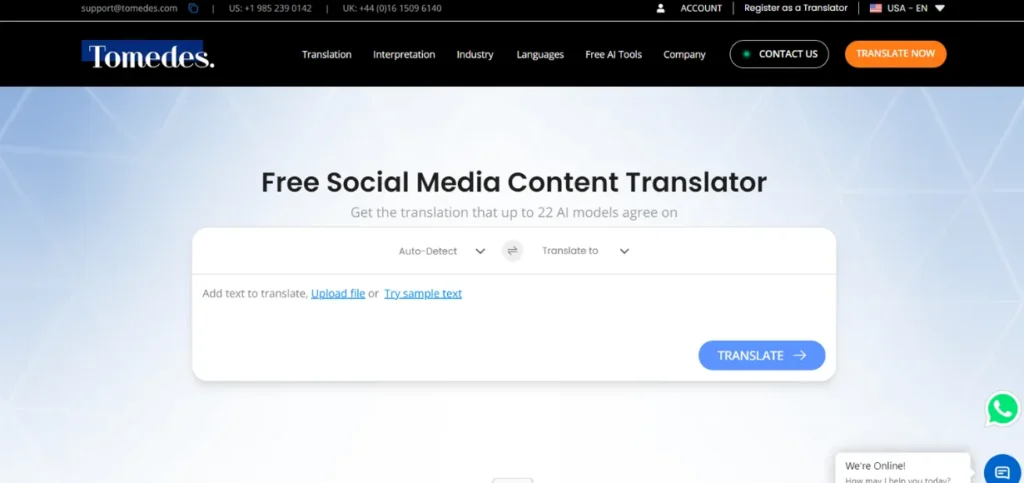The Social Media Content Translator is a free, web-based tool developed by Tomedes, a translation company, built specifically for businesses and content creators who need to translate social media posts, captions, and promotional copy for multilingual audiences. Unlike generic translation tools, it is designed with social media context in mind, preserving the tone, intent, and platform-native voice of the original content rather than delivering a literal word-for-word output.
